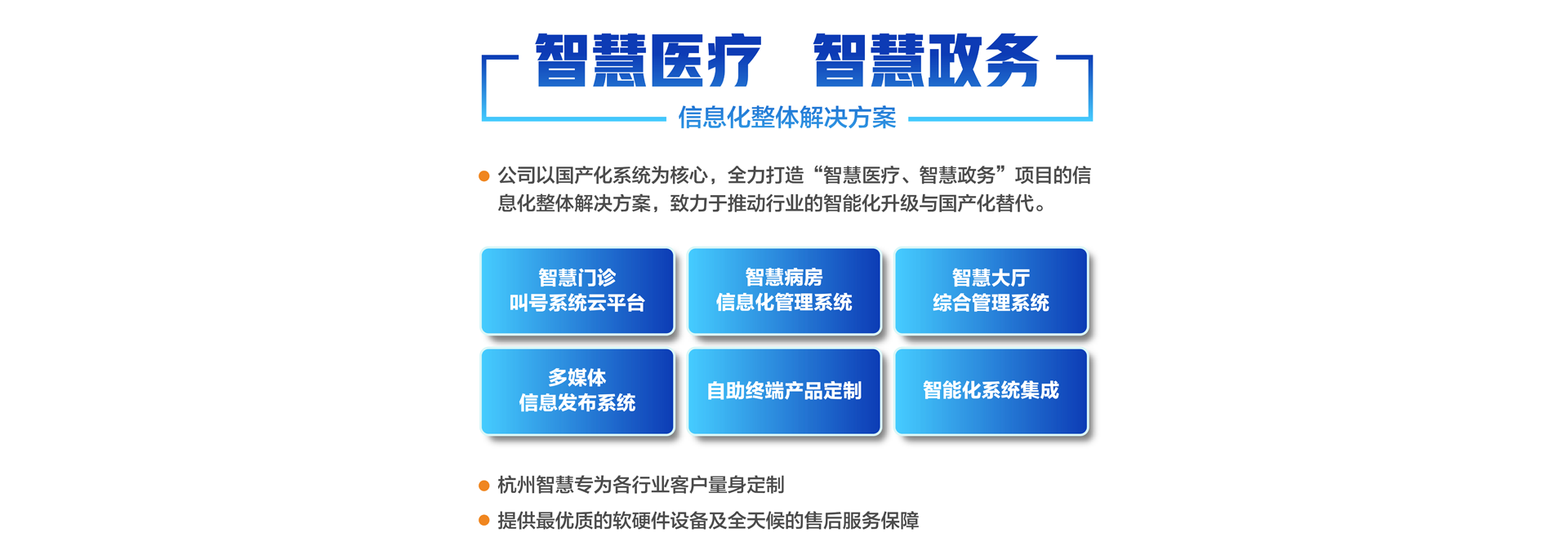 杭州智慧科技有限公司初創(chuàng)于2003年,總部位于重要的電子商務(wù)中心中國(guó)杭州公司主營(yíng)業(yè)務(wù)有:智慧分診叫號(hào)系統(tǒng)、智慧病房醫(yī)護(hù)對(duì)講系統(tǒng)、智慧大廳綜合管理系統(tǒng)、智慧政務(wù)管理系統(tǒng)、智慧多媒體信息發(fā)布系統(tǒng)、導(dǎo)診系統(tǒng)及各自助終端產(chǎn)品定制。專為各行業(yè)客戶量身定制。公司已有20余年行業(yè)經(jīng)驗(yàn)沉淀積累,擁有優(yōu)秀的產(chǎn)品外觀設(shè)計(jì)師和各類中高級(jí)專業(yè)技術(shù)工程師,確保所研發(fā)的產(chǎn)品具有行業(yè)領(lǐng)先的外觀及可靠的技術(shù)性能。并擁有權(quán)威部門頒發(fā)的各類知識(shí)產(chǎn)權(quán)及專利證書,30多項(xiàng)資質(zhì)證書、800多個(gè)合作伙伴、2000多個(gè)項(xiàng)目成功案例經(jīng)驗(yàn)。 智慧產(chǎn)品已遍及全國(guó)各醫(yī)療、政務(wù)、金融、通訊、公安、工商、稅務(wù)等行業(yè),形成以“立足杭州、輻射長(zhǎng)三角、拓展全國(guó)”的戰(zhàn)略發(fā)展格局,產(chǎn)品經(jīng)過歷年不斷創(chuàng)新,形成專業(yè)化、平臺(tái)化,致力于成為智慧產(chǎn)品的領(lǐng)軍企業(yè)。 公司建立了完善的技術(shù)培訓(xùn)及售后服務(wù)中心,并設(shè)24小時(shí)熱線咨詢電話解答用戶反饋的問題。同時(shí)應(yīng)客戶要求定期派技術(shù)人員到 全國(guó)各地進(jìn)行技術(shù)指導(dǎo)輔助用戶正確使用智慧產(chǎn)品并能獨(dú)立安裝、調(diào)試、日常維護(hù)等工作。提供最優(yōu)質(zhì)的設(shè)備及全天候的售后服務(wù)保障,智慧永恒不變的服務(wù)宗旨——致力于客戶的滿意與成功!...